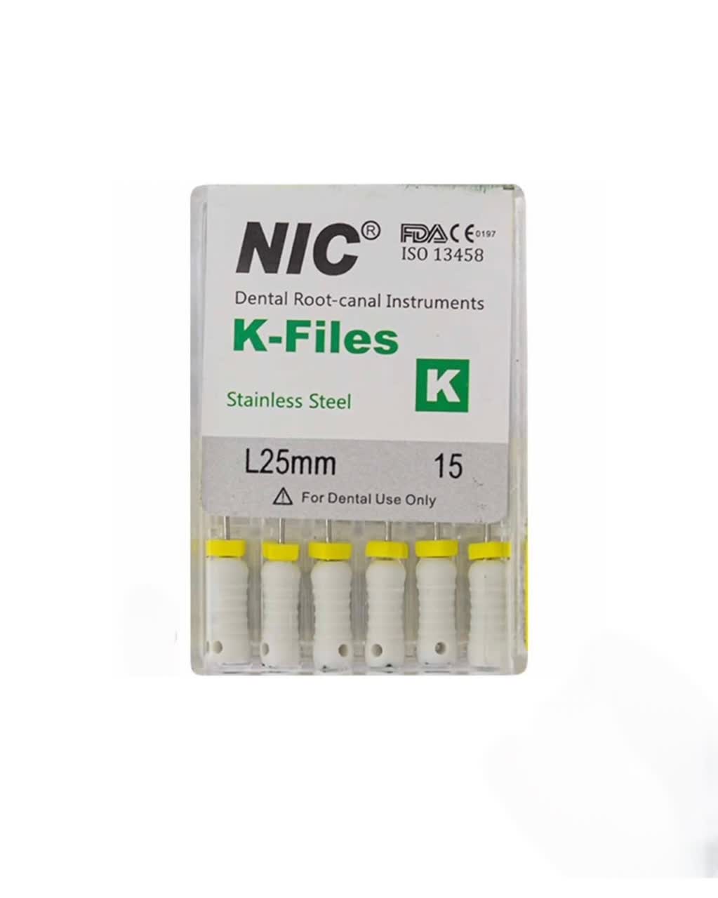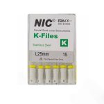 فایل دستی NIC K-File ابزاری استریل، یکبار مصرف و مهم در دندانپزشکی که در فرایند درمان ریشه (عصب‌کشی) دندان به کار می‌رود. این فایل‌ها با داشتن سطح مقطع مربع یا مثلثی شکل، برای پاکسازی و شکل‌دهی اولیه کانال‌های ریشه دندان کاربرد دارند.